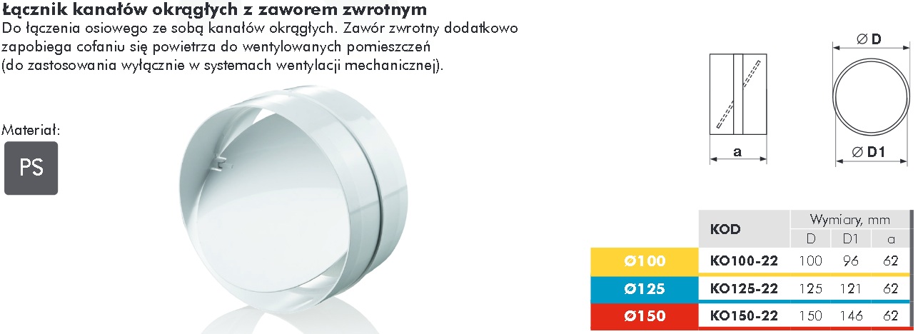 KO125-22 - łącznik z zaworem zwrotnym kanałów okrągłych fi 125mm