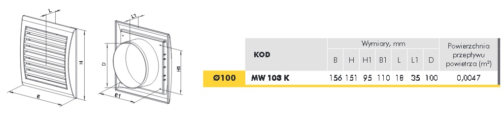 MW103K - kratka wentylacyjna 154x150 mm z siatką i kołnierzem fi 100 mm, biała
