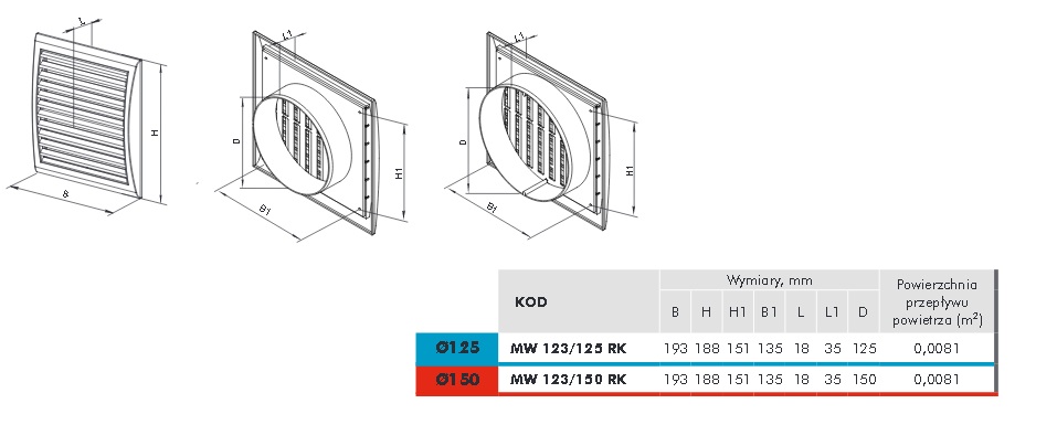 MW123/125RKSAT - kratka wentylacyjna 193x188 mm z siatką, regulowaną żaluzją i kołnierzem fi 125 mm, satyna