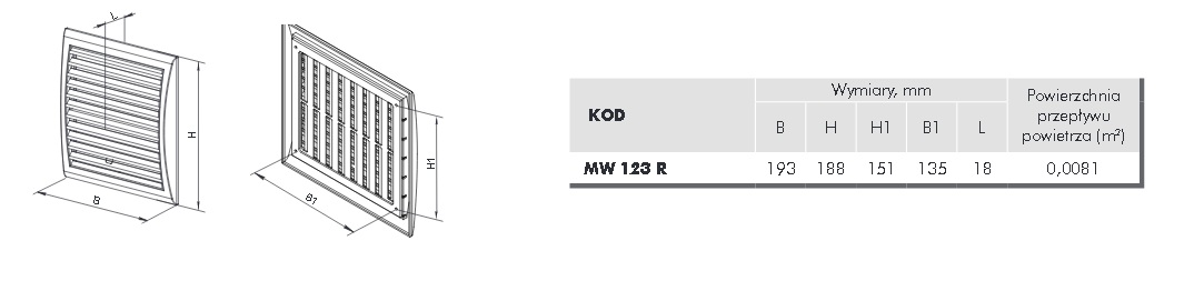 MW123RSAT - kratka wentylacyjna 193x188 mm z siatką i regulowaną żaluzją, satyna